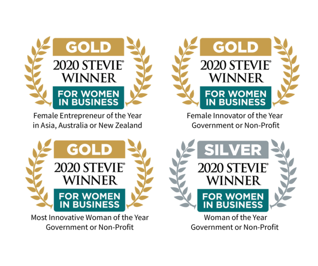 Female Entrepreneur of the Year in Asia, Australia or New Zealand – Gold Stevie Winner Female Innovator of the Year – Government or Non-Profit – Gold Stevie Winner Most Innovative Woman of the Year – Government or Non-Profit – Gold Stevie Winner Woman of the Year – Government or Non-Profit – Silver Stevie Winner The